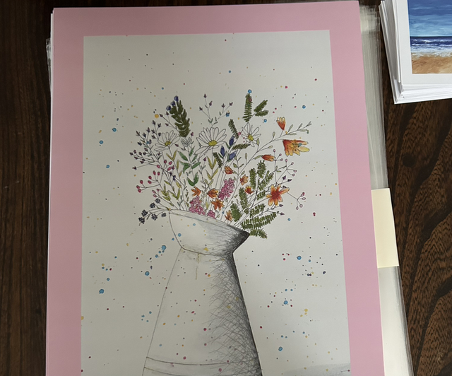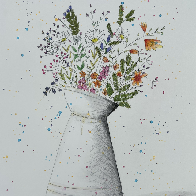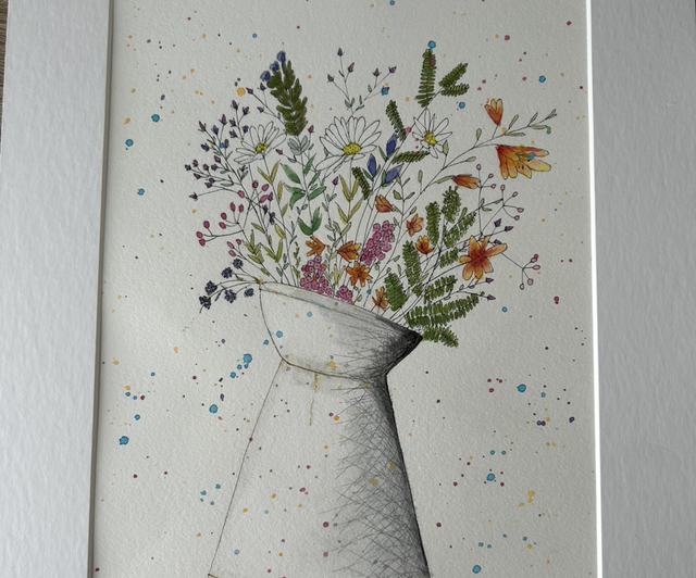 This gouache and pen piece was inspired by a wreath making workshop for the creating connections social art group. This group welcomed me and made me feel at home, such a special group of ladies. A3 Limited Edition of 30 Art print. All prints are numbered and signed by hand and come with a certificate of authenticity. Prints come in a compostable clear sleeve with backing board. Original is A4. Frame not included.