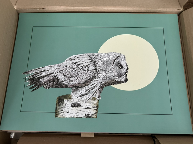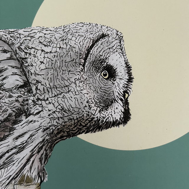 The Great Grey Owl, poised in the calm just before flight. The striking detail of our wise hero, symbolising the owl’s razor-sharp focus. In contrast, the moon and landscape are reduced to clean, geometric forms — a visual reminder that in moments of clarity, the world fades into the background.